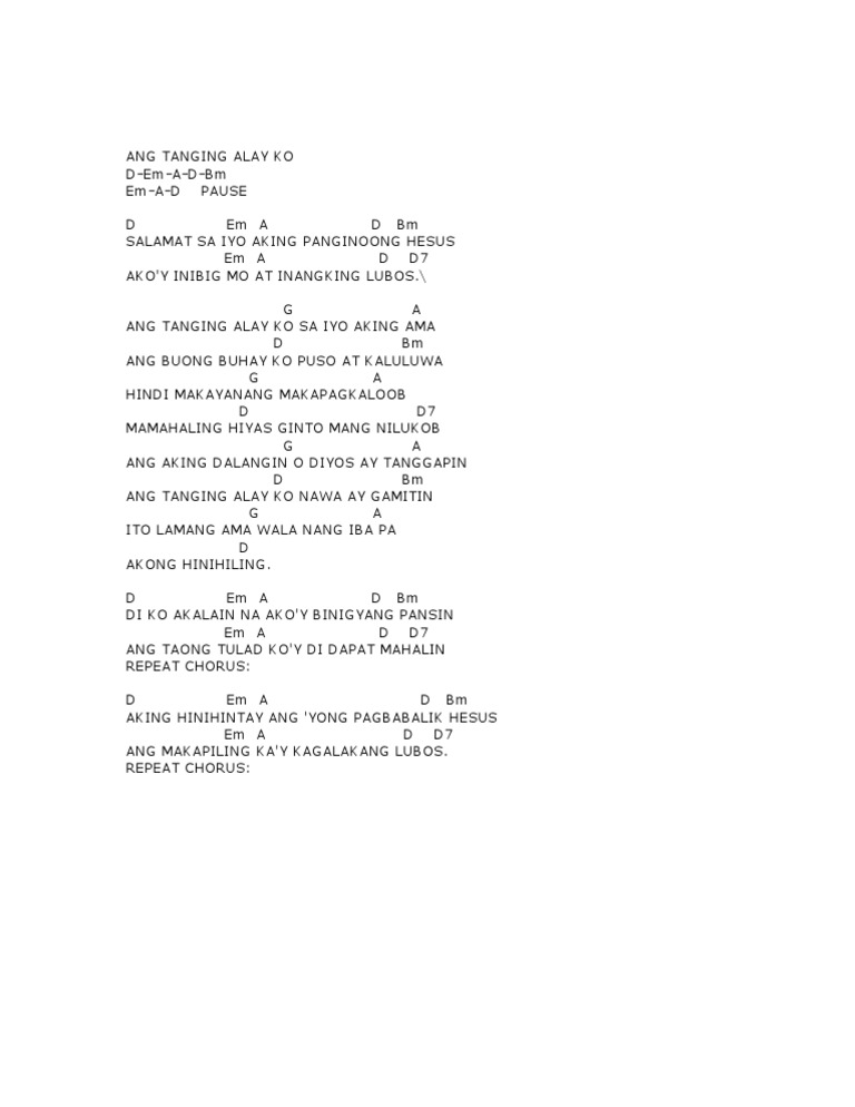 Ang Tanging Alay Ko Standard Tuning D Em A D Salamat sa Iyo aking Panginoong Hesus Em A D Am D7 Akoy inibig Mo at inangking lubos Chorus. Ang tanging alay ko sayo aking Ama. Ang tanging alay ko sa Iyo aking Ama.