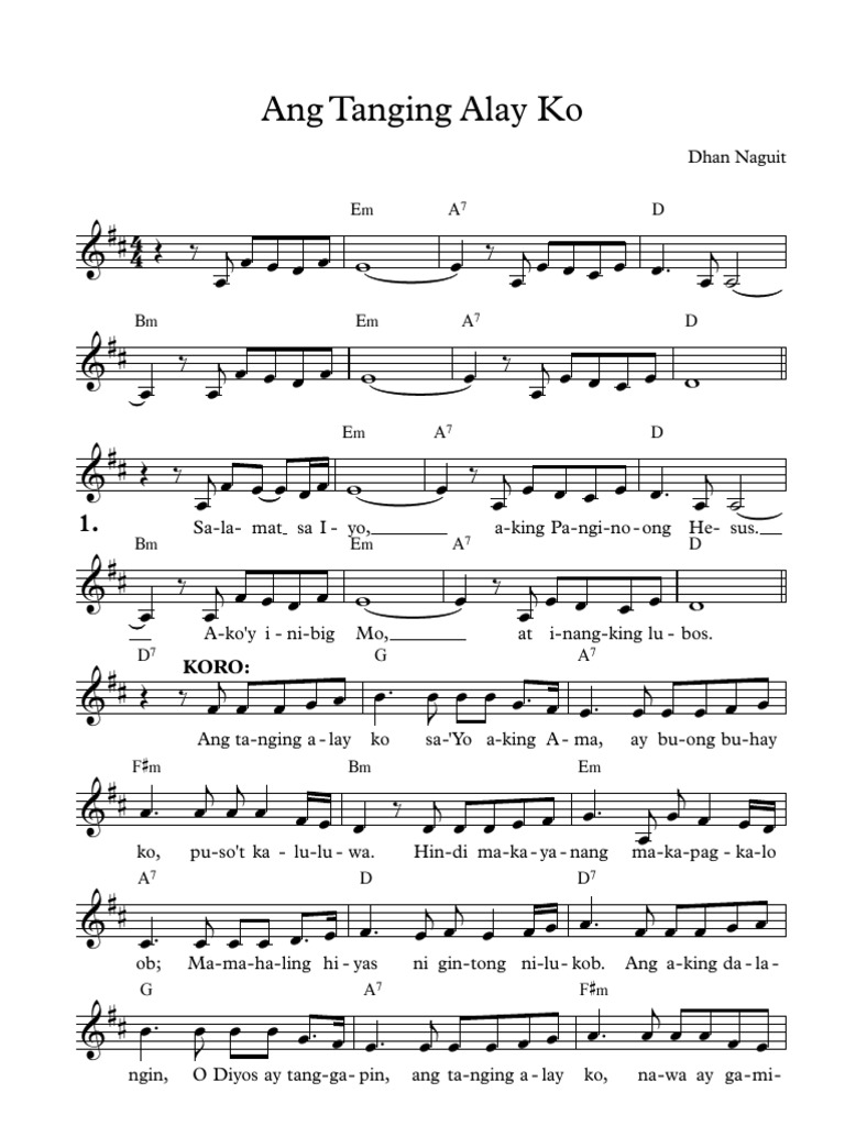 Verse D Em A D Salamat sa Iyo aking Panginoong Hesus Em A D Am D7 Akoy inibig Mo at inangking lubos Chorus G A Ang tanging alay ko sayo aking Ama Fm Bm Ang buong buhay ko pusot kaluluwa Em A. Ang Tanging Alay Ko. 3 3 3 4 5 6 4 6 1.