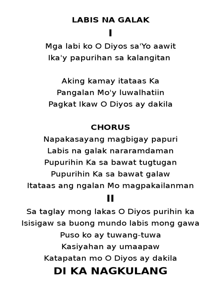 Pag-ibig niyang wagas ay dapat ihayag kung bukang-liwayway pagsapit ng gabi ang katapatan niyay ihayag din naman. Ikaw ang Diyos na aming kanlungan. Panginoong Diyos Hari ng langit.